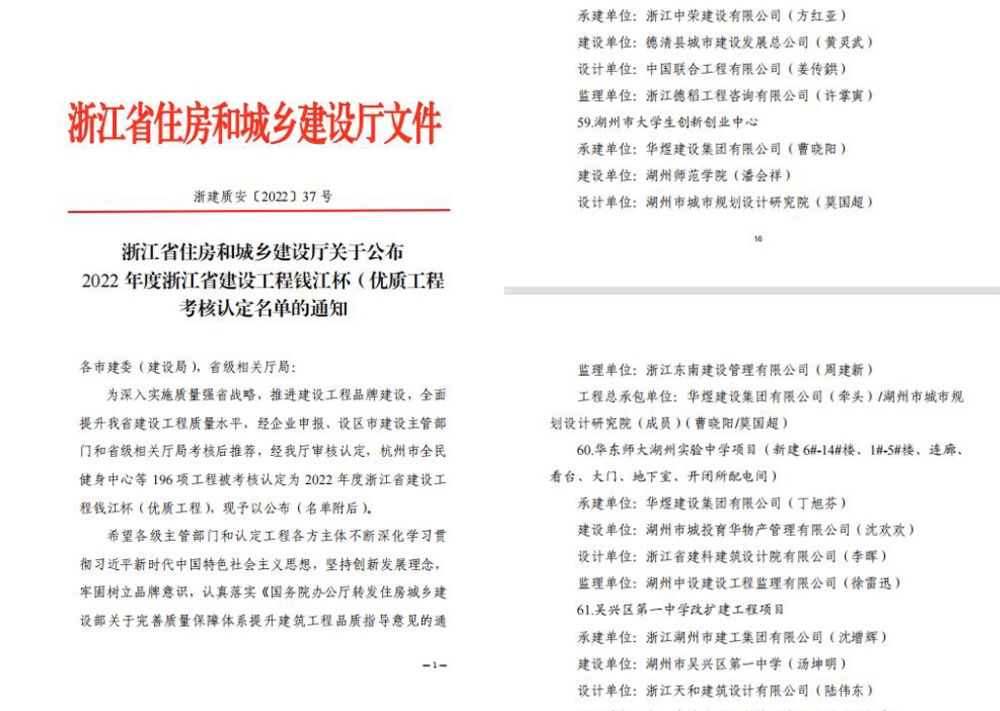 近日,浙江省住房和城鄉(xiāng)建設(shè)廳公布了2022年度浙江省建設(shè)工程錢江杯(優(yōu)質(zhì)工程)考核認(rèn)定名單,我公司承建的“華東師大湖州實驗中學(xué)項目”、“湖州市大學(xué)生創(chuàng)新創(chuàng)業(yè)中心項目”,榮獲2022年度浙江省建設(shè)工程錢江杯(優(yōu)質(zhì)工程)。